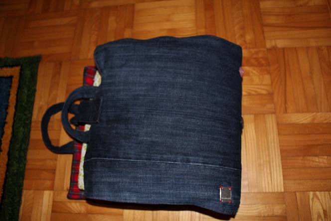 Jeansstoff und Kunstleder vertragen sich hier ziemlich gut und gefüttert ist das gute Ding mit einem Wachstischtuch, damit so manche "Pfütze" rausgewischt werden kann.